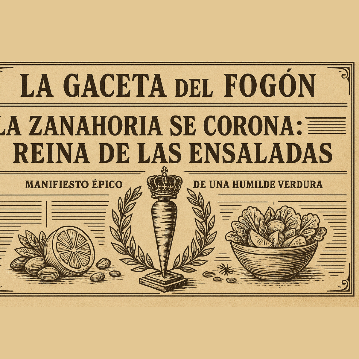 En los archivos amarillentos de esta casa editorial figura una nota al margen escrita a lápiz por un reportero de mercado: “la zanahoria, plebeya brillante, gobierna sin corona”. Ha pasado el tiempo, se han puesto de moda hojas delicadas, brotes con nombre de novela y vinagretas que hablan tres idiomas, pero el lema resiste. Hoy nos convoca su defensa, un alegato de naranja encendido para proclamar que, entre todos los elementos que celebran las ensaladas, la zanahoria no sólo es imprescindible: es soberana. Y como corresponde a un reinado antiguo, su autoridad se ejerce con discreción, paciencia y una dulzura que no empalaga, sino que convoca.