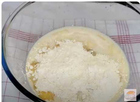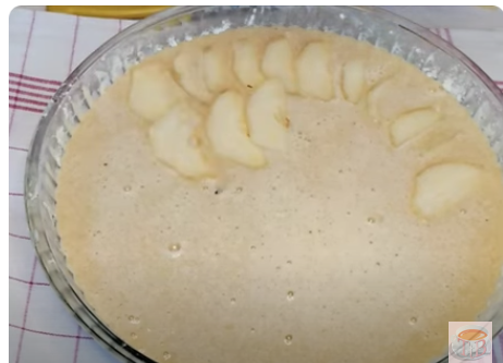 Vierte la mezcla en un bol enharinado y coloca las tiras de pera por encima