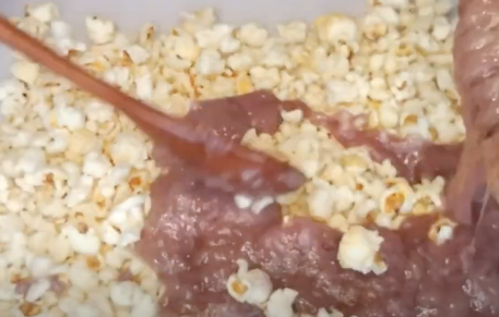 Con cuidado, vierte el sirope de violetas sobre las palomitas y mezcla bien con una espátula para que se reparta. Hazlo rápido, antes de que se endurezca.