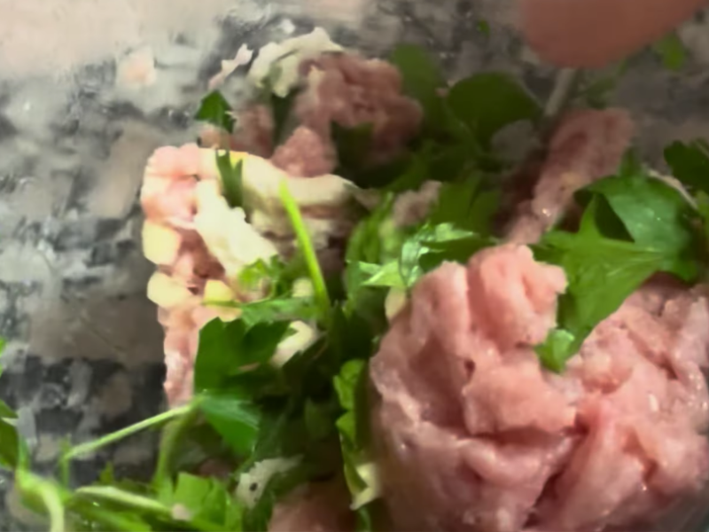 En un bol grande echa la carne picada de pollo. Añade un poco de ajo picadito, el huevo, la miga de pan con leche (bien escurrida), un poco de perejil picado y salpimienta al gusto.