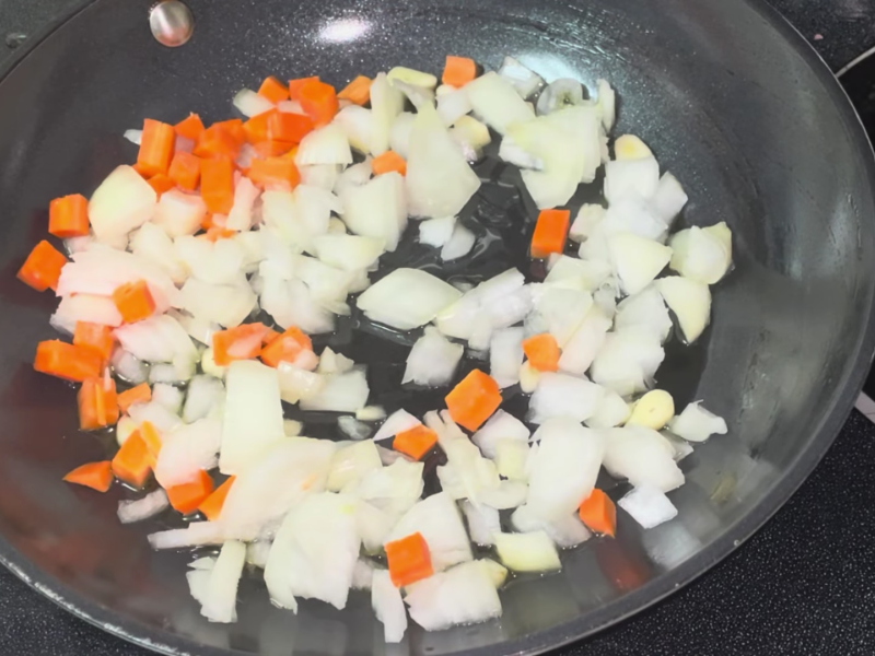 En la misma sartén donde freíste las albóndigas quita un poco de aceite si ves que ha quedado mucho. Deja solo lo justo para pochar las verduras. Añade la cebolla, la zanahoria y los ajos bien picados. Cocina a fuego medio-bajo con una pizca de sal para que suelten su jugo y se pochen sin prisas. Este paso tarda unos diez minutos pero merece la pena porque aquí es donde empieza el sabor.