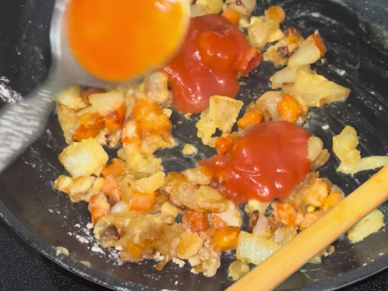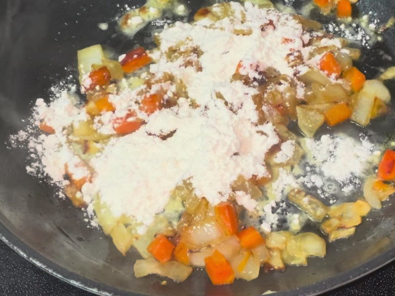 Cuando la cebolla esté transparente y la zanahoria bien blandita añade el vino blanco. Sube un poco el fuego y deja que el alcohol se evapore. Notarás cómo cambia el olor y se vuelve más suave. Es el momento de añadir las cucharadas de harina. Remueve bien para que no se formen grumos y cocina un minuto para quitarle el sabor a crudo. Después, añade el tomate frito.