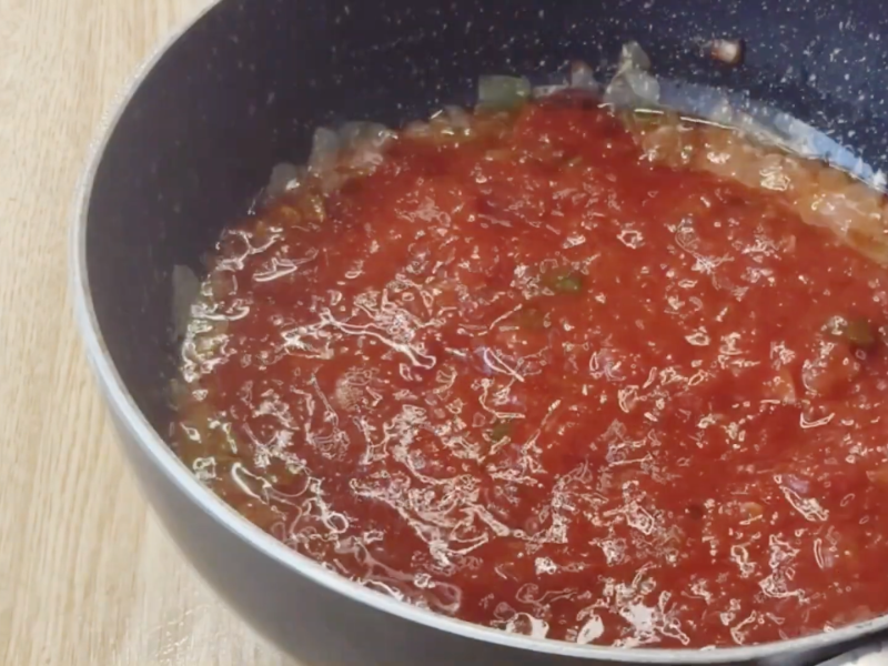 Cuando la cebolla esté tierna y transparente, añade el tomate triturado, la sal, la pimienta, la albahaca y, si lo notas muy ácido, una pizca de azúcar.