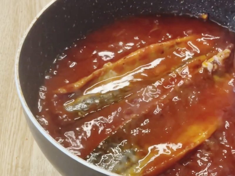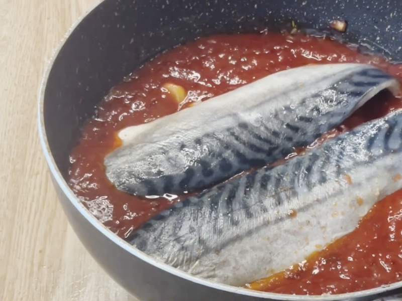 Cuando la salsa esté lista, baja el fuego y coloca los filetes de caballa.