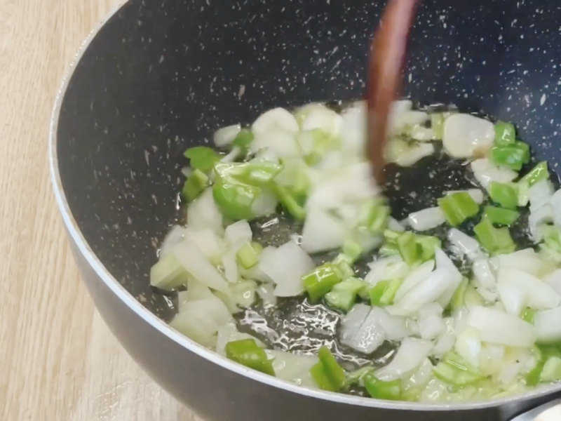 En una sartén grande o cazuela baja, echa el aceite de oliva y ponlo a fuego medio. Añade la cebolla picada, el ajo y el pimiento, y deja que se poche con calma durante unos cinco minutos.