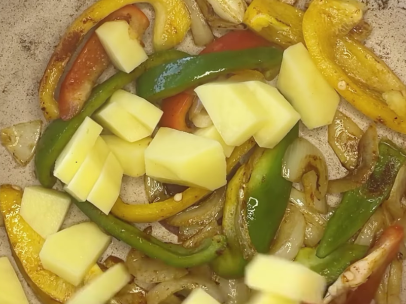 En una sartén grande o cazuela baja, echo un buen chorro de aceite de oliva virgen extra y, cuando está caliente, añado la cebolla, el ajo, y los pimientos. Lo dejo hacer a fuego medio-bajo, sin prisas, hasta que todo está blandito y empieza a dorarse, añade la patata.