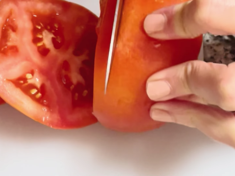 Corta los tomates en rodajas y sécalos con papel absorbente, para que la masa no se ablande.