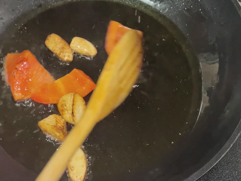 Remueve bien para que se integre con el aceite y el pimentón. Verás cómo empieza a formarse una base espesa y aromática.