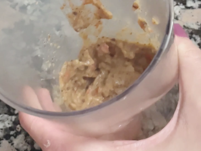 Añade un poco de agua si es necesario para ajustar la textura. La mezcla debe quedar como una salsa ligera, no demasiado líquida pero tampoco seca.