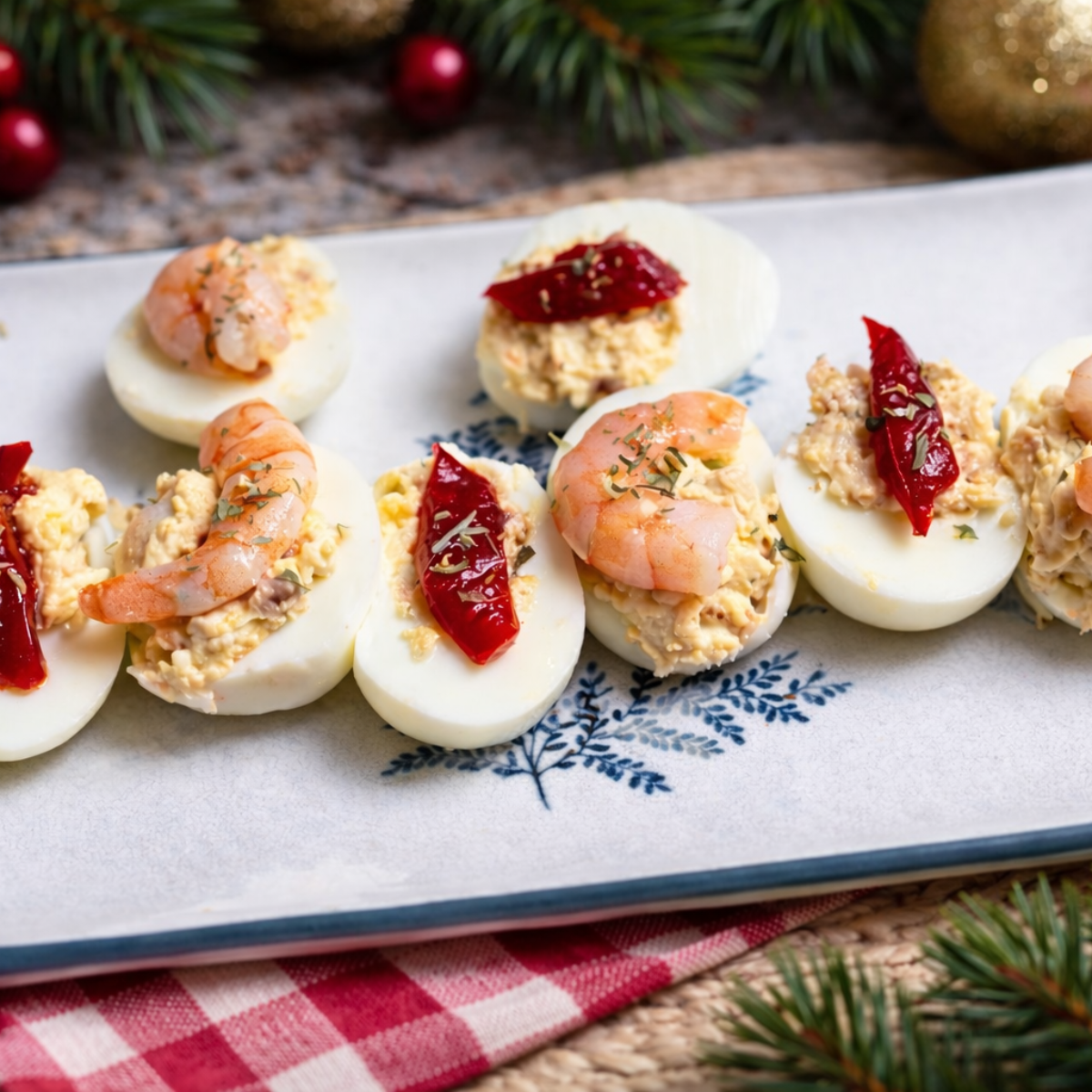 bandeja de huevos rellenos con atún y langostinos en mesa de navidad