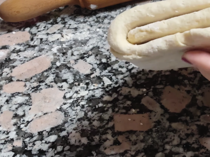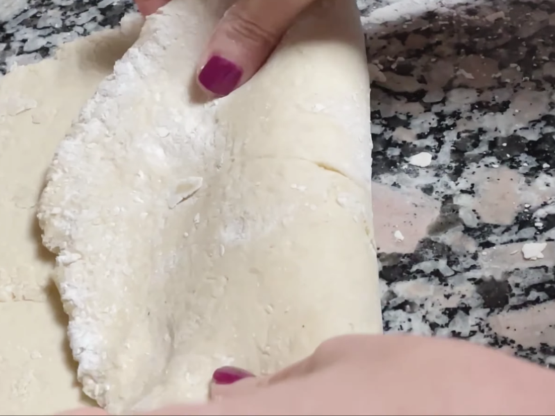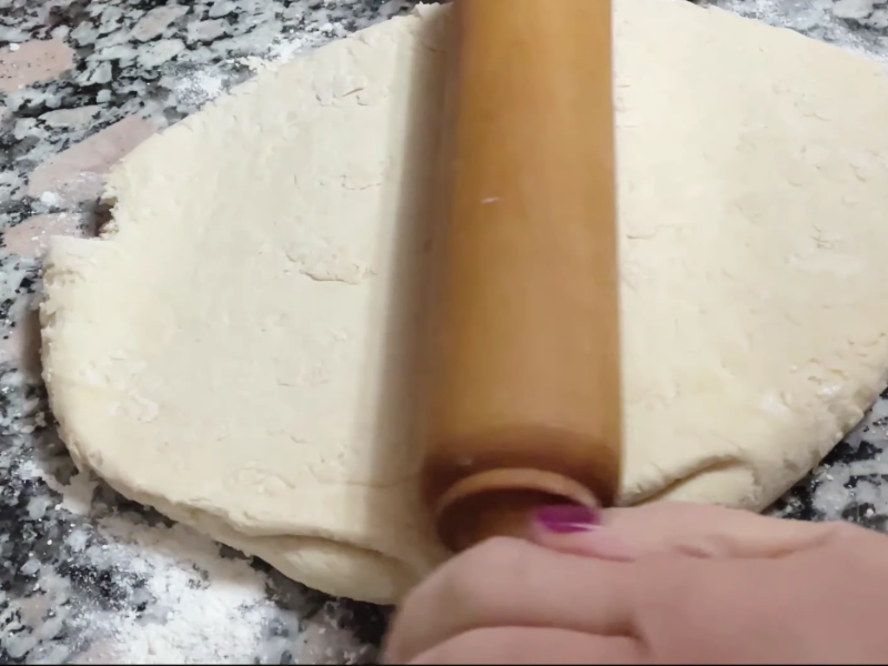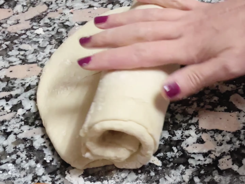 Estira con ayuda de un rodillo y pliega en tres veces, repito esto dos veces más, pero la última vez en vez de doblarlo enrrollálo