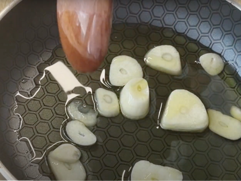 Calienta el aceite y añade los ajos hasta que se doren, después retíralos y reserva.