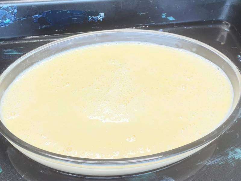 Vierte la crema en el molde caramelizado y colócalo dentro de una bandeja de horno con agua templada, procura que el agua llegue hasta la mitad del molde.