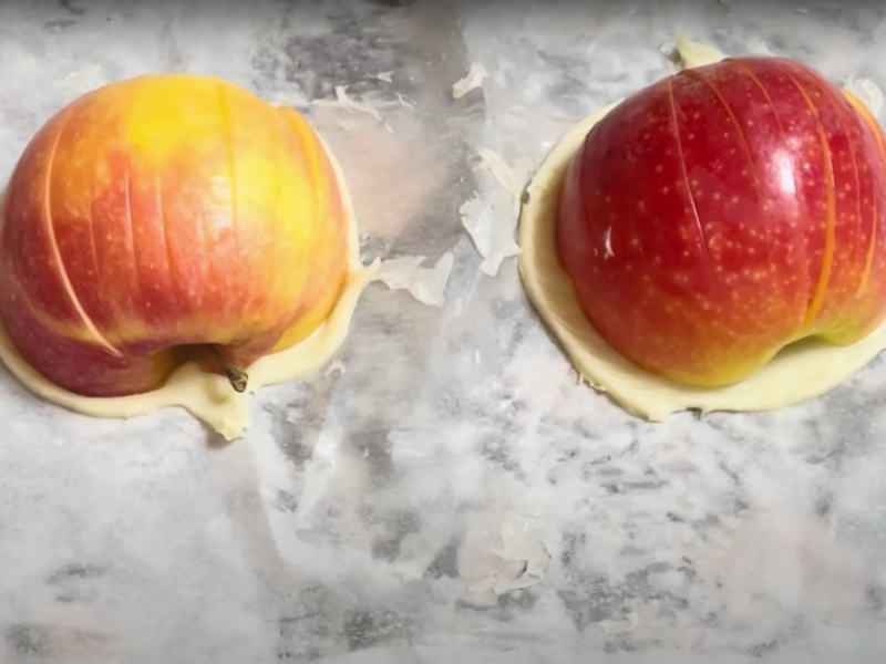 Pon cada mitad de manzana sobre la lámina de hojaldre y corta éste último siguiendo la forma de las manzanas.