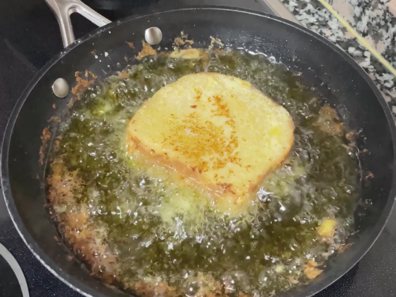 El aceite se calienta en una sartén amplia a temperatura media. Las torrijas se fríen hasta que están doradas por ambos lados.