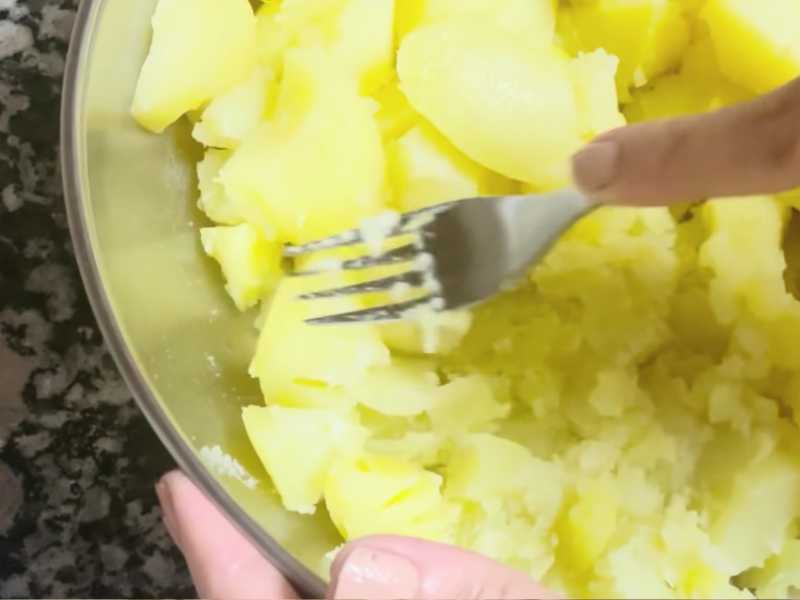 Coloca las patatas en un bol amplio y aplástalas con un tenedor o un pasapurés.