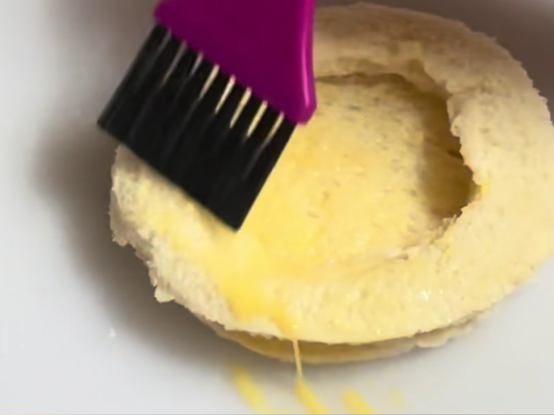Bate un huevo y con una brocha cocina pincela la superficie del volován. Esto les da un color dorado precioso al hornearlos. Además, sirve para unir las rebanadas.