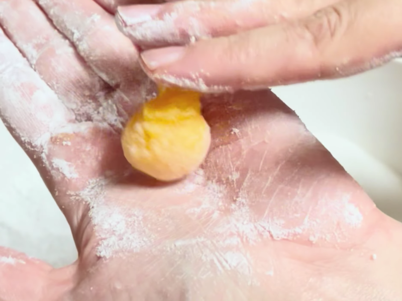 Toma pequeñas porciones de la masa y forma bolitas con las manos.