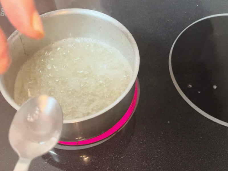 Coloca el agua y el azúcar en un cazo pequeño. Llévalo a fuego medio y deja que el azúcar se disuelva poco a poco.